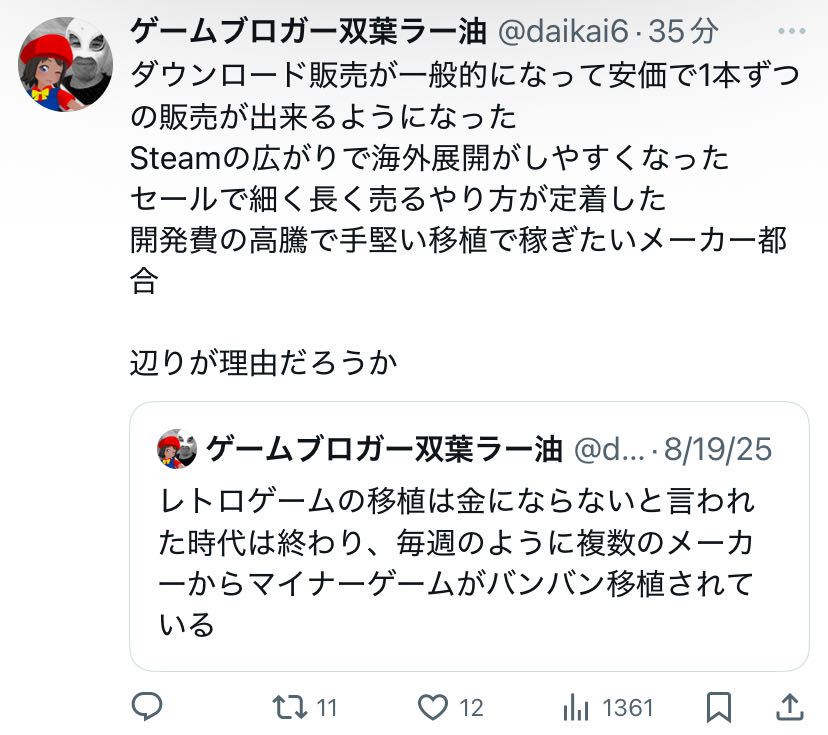 ゲーマーの高齢化と過去ハードの老朽化で既存作品の移植が望まれやすくなったのもある