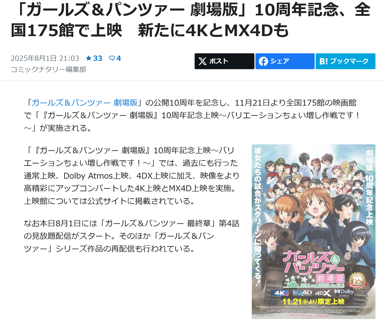 うちの近所に映画館新設されてデモ的にガルパンのdolby atomos版を最近流してたけど音響いいとすごいねあれ…細かいキュラキュラから装甲にカンカン当たるのからめっちゃクリア…