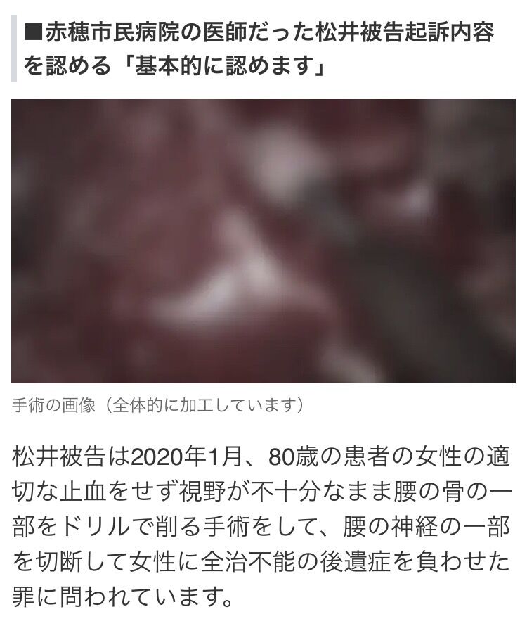 【脳外科医 竹田くん】脳外科医竹田くんのモデルとなった松井宏樹さん(47)が初公判 2026年02月17日 カテゴリ:脳外科医 竹田くん漫画 名無しさん26/02/11(水)18:28そうだねx3>同業である脳外科医の調書には「私としては信じられない手術視野」「出血ありきの手術。視野が全く確保できていない。事故が発生して当然と言わざるを得ない。医療過誤である」と厳しい言葉が並ぶ。同業からひどい言葉を浴びせられるnews.yahoo.co.jpnews.yahoo.co.jp 1: 名無しさん26/02/11(水)18:30そうだねx117何わろてんねん 2: 名無しさん26/02/11(水)18:35そうだねx121…いやそれ極めて適切な表現なのでは? 3: 名無しさん26/02/11(水)18:36そうだねx56この医師探し出して訴えそうなのが嫌 続きを読む タグ :#脳外科医竹田くん